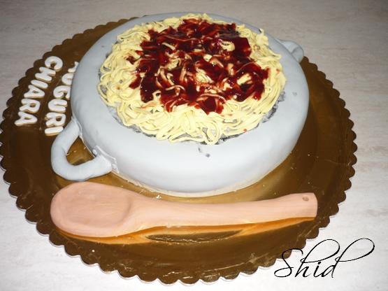 La base è un PDS farcito con Crema Chantilly e scaglie di cioccolato. La bagna è di latte e maraschino. Lo strato tra la torta e la copertura è di Crema di Burro. La copertura e le decorazioni sono in PDZ acquistata, il sugo di pomodoro sulle tagliatelle è salsa di fragola.